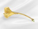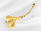 Goldene vintage Designer-Goldschmiedebrosche Motiv "Ginkgoblatt" mit Fancy Brillanten und Turmalin: Ca. 73 x 26mm, ca. 9,4g, 18K Gelbgold, rückseitig Broschierung, schauseitig besetzt mit einem grünen Farbstein, verm. Turmalin, zudem 3 kleine fancy Brillanten, Hersteller-Punze, vermutlich unikate Designer-Goldschmiedearbeit, schöner Zustand.