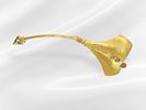 Vintage gold designer brooch with ‘ginkgo leaf’ motif, set with brown brilliant-cut diamonds and tourmaline: Approx. 73 x 26mm, approx. 9.4g, 18K yellow gold, back with brooch, face set with a green stone, probably tourmaline, also 3 small brown brilliant-cut diamonds, maker's punch, probably unique designer goldsmith work, beautiful condition.